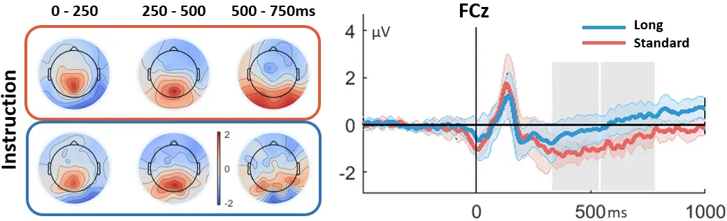 Blink‐related potentials during the presentation of navigation instructions. Left panel displays the topography of the activity averaged across three time windows of 250ms. Top row represents the standard and bottom row the landmark-based navigation instruction condition. Right panel shows the blink-related potential at FCz. Baseline correction was done by subtracting the average activity of ‐400 to ‐200 ms. Grey areas represent time windows where samplewise significant differences were found between the two navigation instruction conditions. Positivity is plotted upwards.