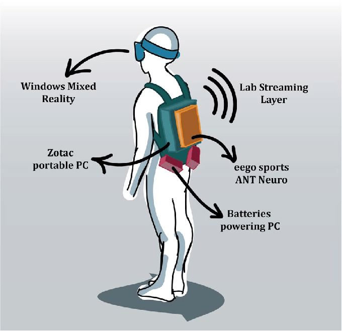 It was crucial to this approach that EEG data can be acquired continuously, while the subject kept moving and interacted with the virtual environment based on Unity. Thereby, we utilize the eego™ sport 64-channel EEG system and load the amplifier and the high-performance gaming computer (Zotac) onto a backpack that allows the participant to remain mobile. The Zotac system renders the VR environment and has a Windows Mixed Reality headset connected to it (Figure 1). All data streams are recorded and synchronized using the Lab Streaming Layer (LSL) protocol.